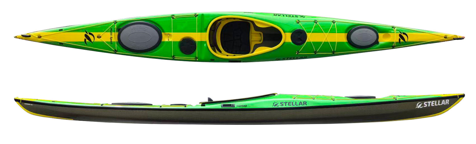 The Nomad line is a sharp departure from Stellar's existing offerings. They leaned into more traditional European designs with sharped and elongated chines and rocker for improved edging and carving. This boat is both playful yet stable in the surf and an excellent full featured expedition kayak.